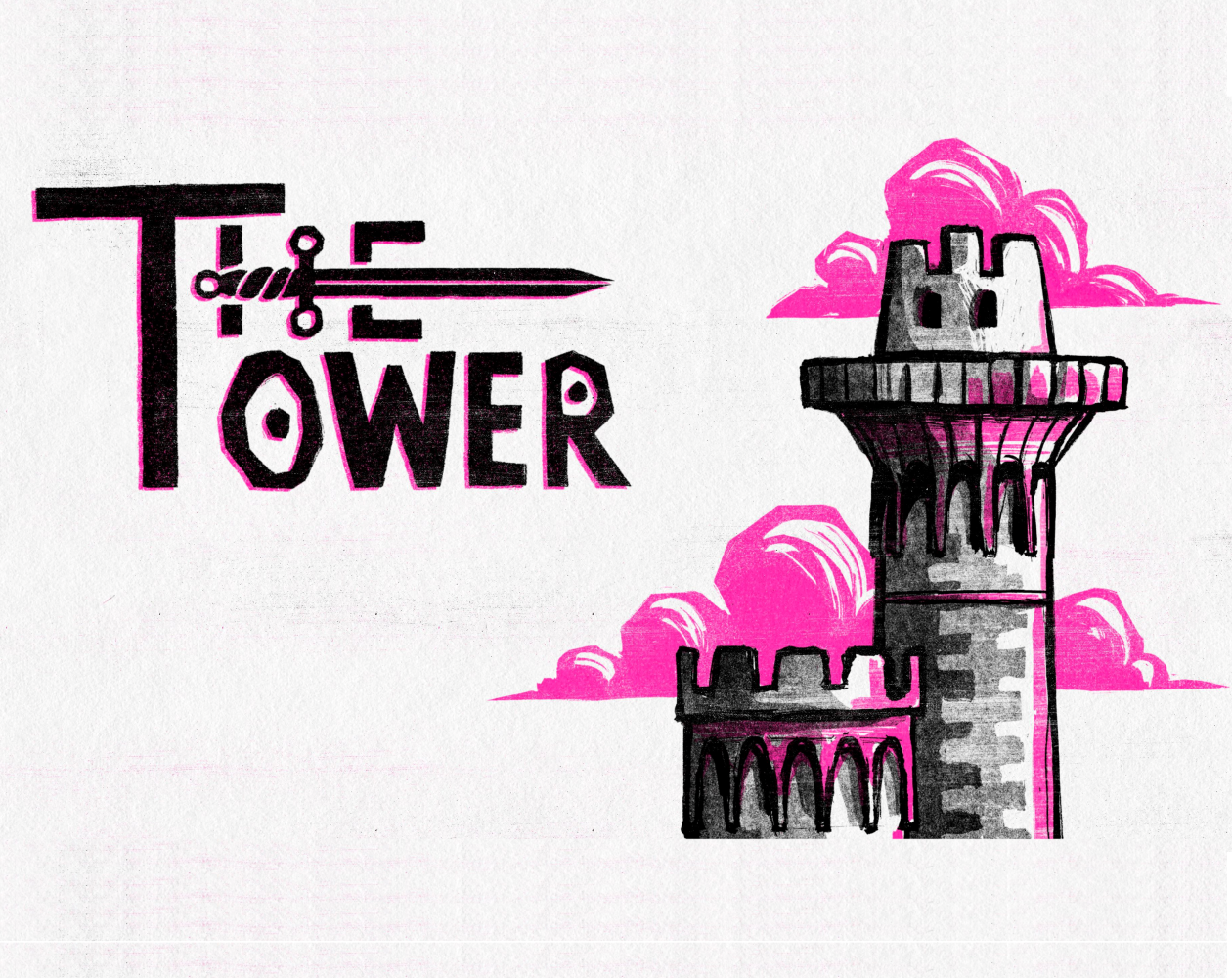 Physical copies of The Tower are risograph printed zines on 150gsm Arden White paper in Black and Fluorescent Pink. With a special overlay sheet in 100gsm tracing paper for one of the riddles and the looted sword.